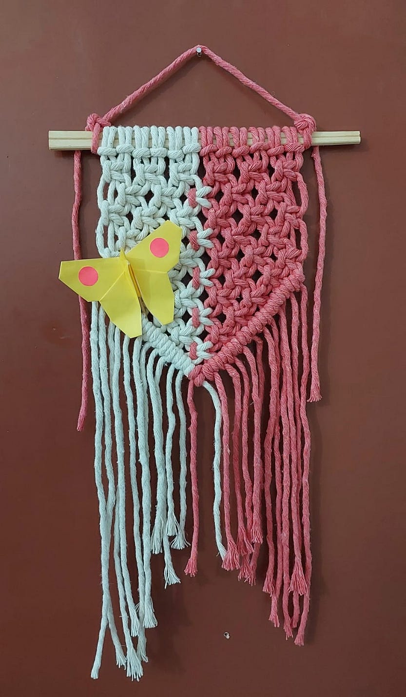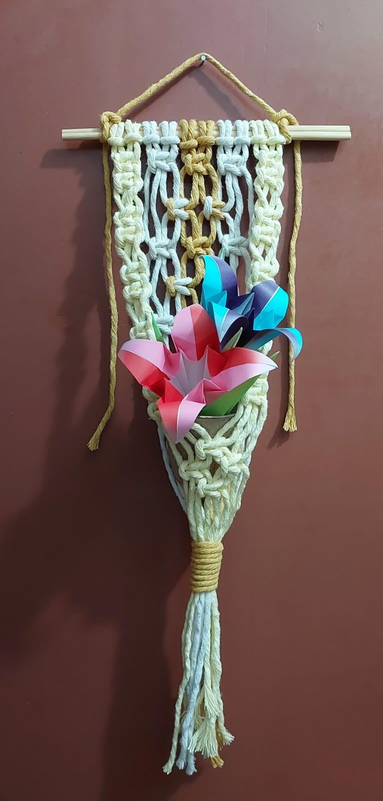 Certa vez, queria confeccionar uma peça para dar de presente e fiz um painel porta-vasos de macramê. Mas achei que faltava algo e coloquei um vasinho com flores de papel. Ficou perfeito.